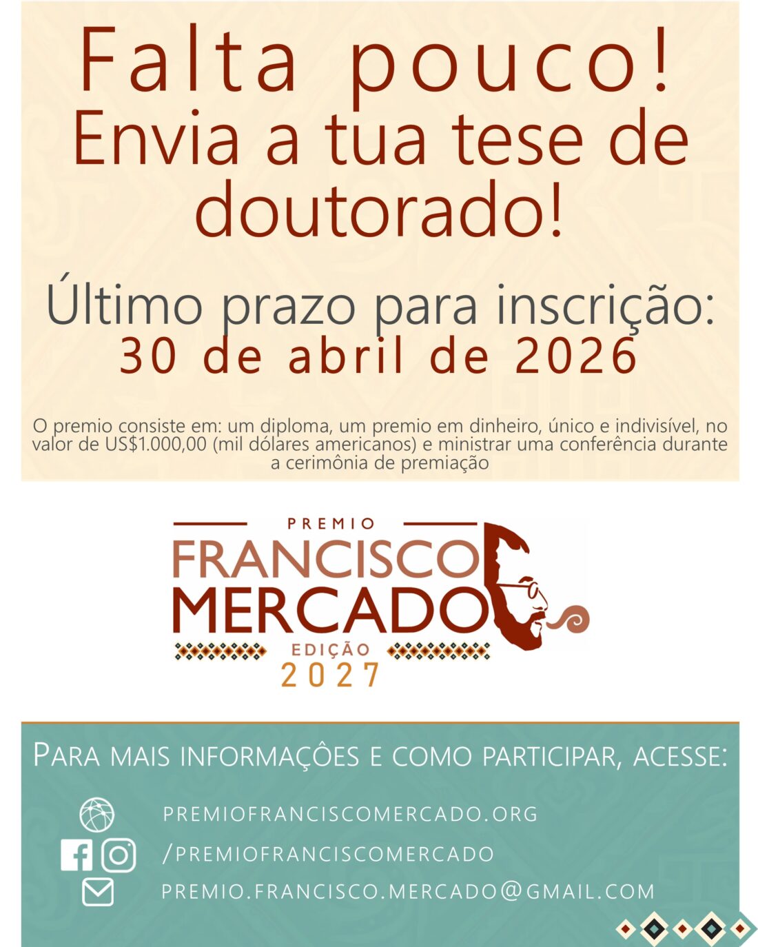 Apenas restam um més para o encerramento das inscrições para a Edição 2027 do Prêmio Francisco Mercado! Envia a tua tese de doutorado!