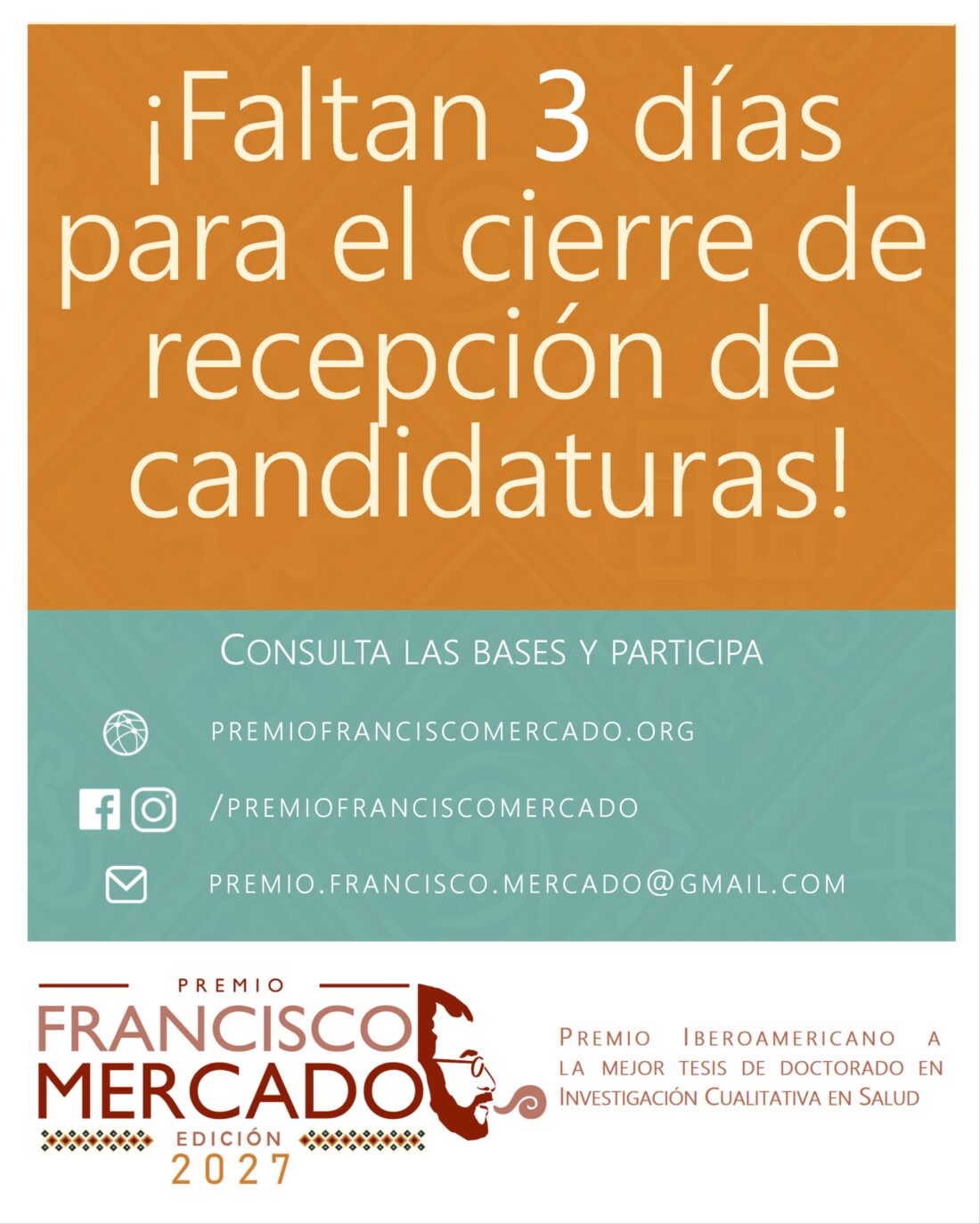¡Solo queda un mes para el cierre de recepción de postulaciones para la Edición 2027 del Premio Francisco Mercado! ¡Envíanos tu tesis de doctorado!